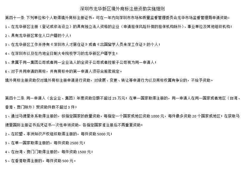 根據深圳市龍華新區境外商標注冊資助實施細則第42條