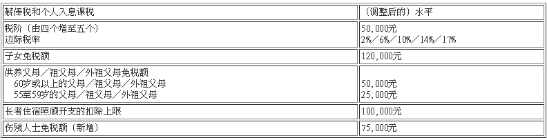 新條例落實二零一八至一九年度政府財政預(yù)算案所建議的稅收寬減措施。有關(guān)措施包括一次性寬減二零一七/一八課稅年度百分之七十五的薪俸稅、個人入息課稅及利得稅,每宗個案以30,000元為上限。新條例亦落實由二零一八/一九課稅年度起,與薪俸稅和個人入息課稅有關(guān)的稅收寬減措施,詳情如下: