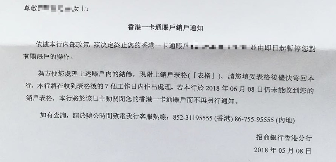 為方便您處理上述賬戶(hù)內(nèi)的結(jié)余,現(xiàn)附上銷(xiāo)戶(hù)表格。請(qǐng)您填妥表格后盡快寄回本行,本行將在收到表格后的七個(gè)工作日內(nèi)作出處理。若本行于2018年06月08日仍未能收到您的銷(xiāo)戶(hù)表格,本行將于該日主動(dòng)關(guān)閉您的香港一卡通賬戶(hù)而不再另行通知。