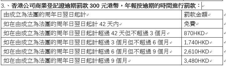 1)香港公司注冊署——完成周年申報文件A 時間:按每一個周年辦理。B 費用:政府收105。C 作用:以做最新的備案,是公司在這一年內有沒有資金、股東、及董事變更、或其他情況等。D 逾期罰款:注冊處周年申報逾期費用詳細(按遞交日期不同收取不同費用):如在由成立為公司的周年日翌日起計超過42天但不超過3個月 HKD 870如在由成立為公司的周年日翌日起計超過3個月但不超過6個月 HKD 1,740如在由成立為公司的周年日翌日起計超過6個月但不超過9個月 HKD 2,610如在由成立為公司的周年日翌日起計超過9個月以上 HKD 3,480最高罰5萬及每日罰700 ,所有責任由董事承擔。要是您的不打算運營的話,您最好是選擇停業或者是注銷公司,否則的話,要是一直公司不做年檢,欠了政府部門的款項,香港的出入境署是有登記的,這樣對您以后進出香港會有一定的影響。 (2)香港稅務局——更換商業登記證A 時間:證書上到期的時間。(可以提前1個月領?。〣 費用:政府收費RMB450到2,600之間,此費用為政府費用,隨政府的調整而浮動。香港政府會根據每年的政府財政運營支出情況對香港公司年審的商業登記證費用做一個調整,如果政府運營狀況好的話,那么價格會相對較優惠。C 作用:主要是延續香港公司的合法經營權利,同時銀行也需要這份文件來證實公司可以繼續使用帳戶。D 逾期罰款:商業登記證失效超過30天,即會產生稅務局登記逾期罰款HKD 300 因上述逾期還可能會收到法院傳票,被要求上法院應訴及支付相應的上庭費用。 3. 香港稅務局一般在公司注冊成立日后18個月左右發出第一份報稅表;之后需每年按評稅基期報稅。