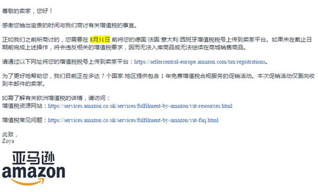 近日有部分亞馬遜賣家反饋稱,收到亞馬遜Amazon要求,在8月份底前,亞馬遜后臺必須提供相關站點的VAT稅號,否則將可能被移除銷售權。VAT猶如定時炸彈,時刻讓賣家們提心吊膽,被凍資金、被封店鋪,甚至因此損失上百萬美金。