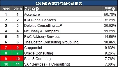 IT咨詢行業傳統一直是兩強爭霸,埃森哲與IBM是其中的王者,但是最近IBM重新開始新一輪業務轉型,企業重心更為聚焦下一代信息技術、云與人工智能。目前在得票率上已經被埃森哲拉開差距,而其后德勤正在緊緊追趕,不知道明年的榜單會上演榜眼與探花易位的一幕么?