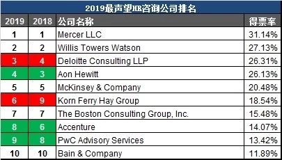 HR咨詢的得票率差距幾乎是所有細分領域內最小的,雖然美世蟬聯冠軍,但是我們可以看到德勤,麥肯錫,PWC也在蠶食傳統人力咨詢四強的業務。而Hay Group在并購之后,逐步扭轉下跌勢頭,在今年的榜單中直升3位。