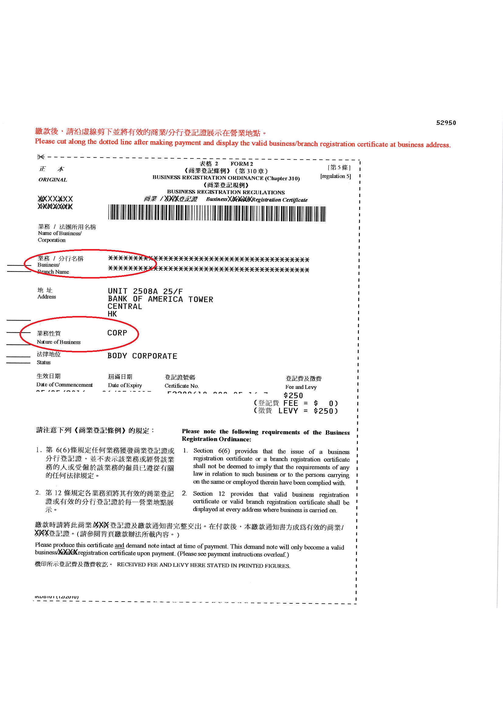 香港公司證件——商證登記證中的業務性質項目,平常表述為“CORP”,意思是還沒有規定具體的業務范圍。如已開業經營,需要變更為實際發生的業務。