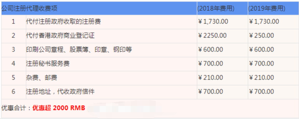 香港老牌企業(yè)注冊(cè)服務(wù)代理——香港駿誠(chéng)商務(wù)為您介紹2018年和2019年香港公司注冊(cè)費(fèi)用對(duì)比: