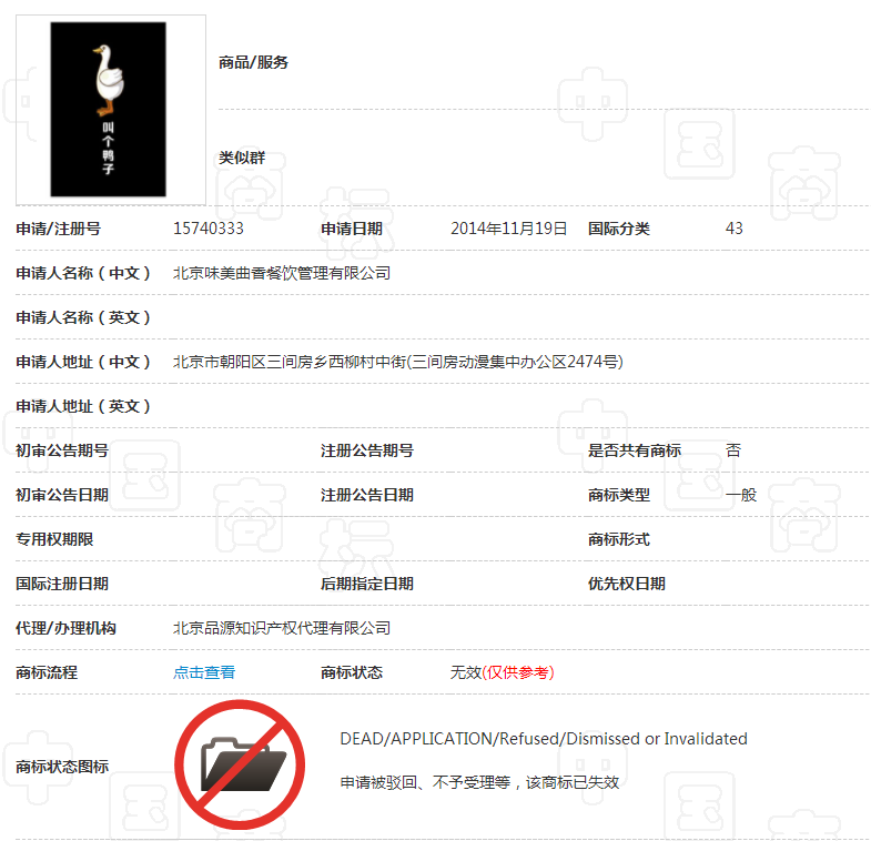 由北京味美曲香餐飲管理有限公司(即本案申請人)于2014年11月19日提出注冊申請“叫個鴨子及圖”商標(以下稱申請商標),指定使用在第43類“住所代理(旅館、供膳寄宿處)、烹飪設備出租”等服務上。后經審查,以申請商標標識文字部分使用在指定服務項目上,直接表示了該服務的內容等特點,并易造成不良社會影響,不得作為商標使用,違反了《商標法》第十條第一款第(八)項的規定為由駁回其注冊申請。2016年6月7日,申請人不服上述駁回決定,依法提出駁回復審