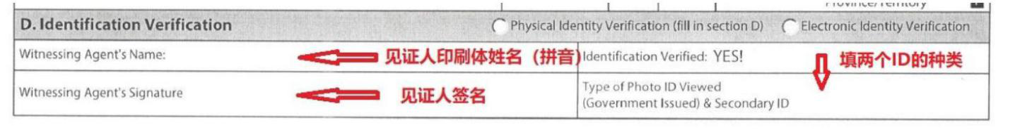 3、表格的D項-(Identification Verification )內(nèi)容,需要見證客戶兩個 ID 的見證人簽名,填表說明如下所示