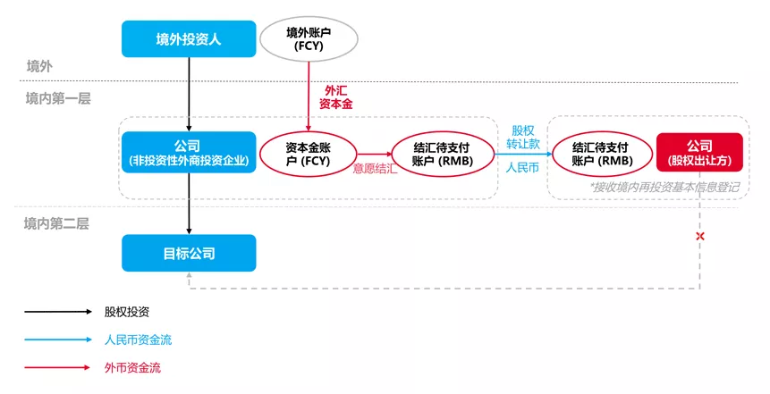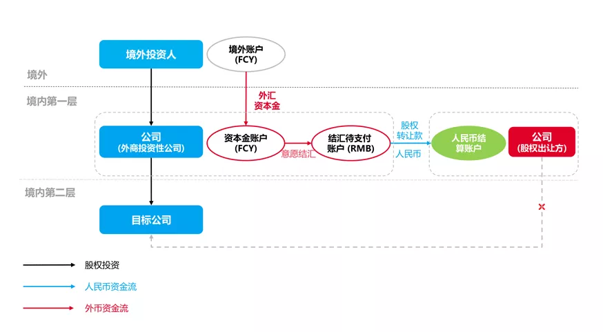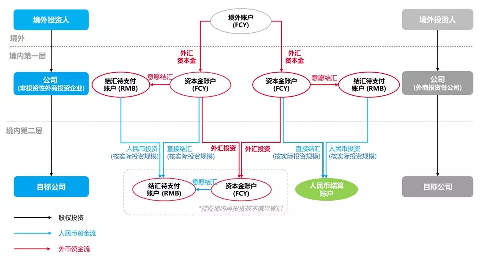在利用結匯人民幣資金以股權并購的方式進行境內再投資的情形下,就外商投資性公司而言,資本金應當匯入股權出讓方的人民幣結算賬戶且資金使用不受限制,賣方無須進行接收境內再投資基本信息登記;而就非投資性外商投資企業而言,資本金應當匯入股權出讓方的結匯待支付賬戶,由股權出讓方按照結匯待支付賬戶的支出范圍進行使用,賣方還應辦理接收境內再投資基本信息登記。