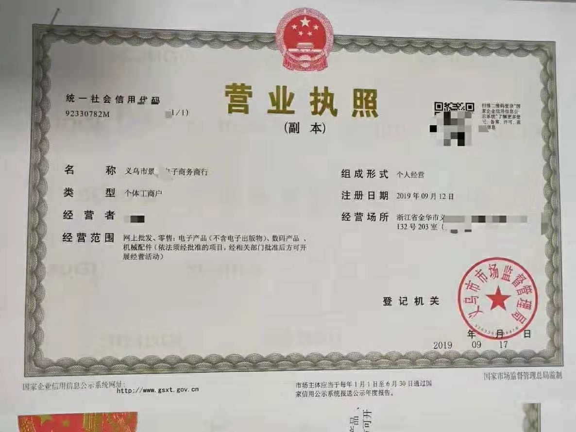 3)個體戶名稱:義烏市xx電子商務商行(一般工商隨機)