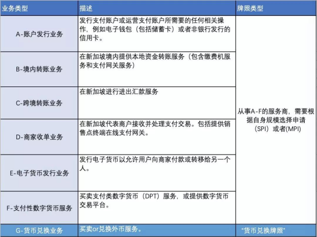 按照新加坡金管局規(guī)定,受監(jiān)管支付業(yè)務以及牌照類別
