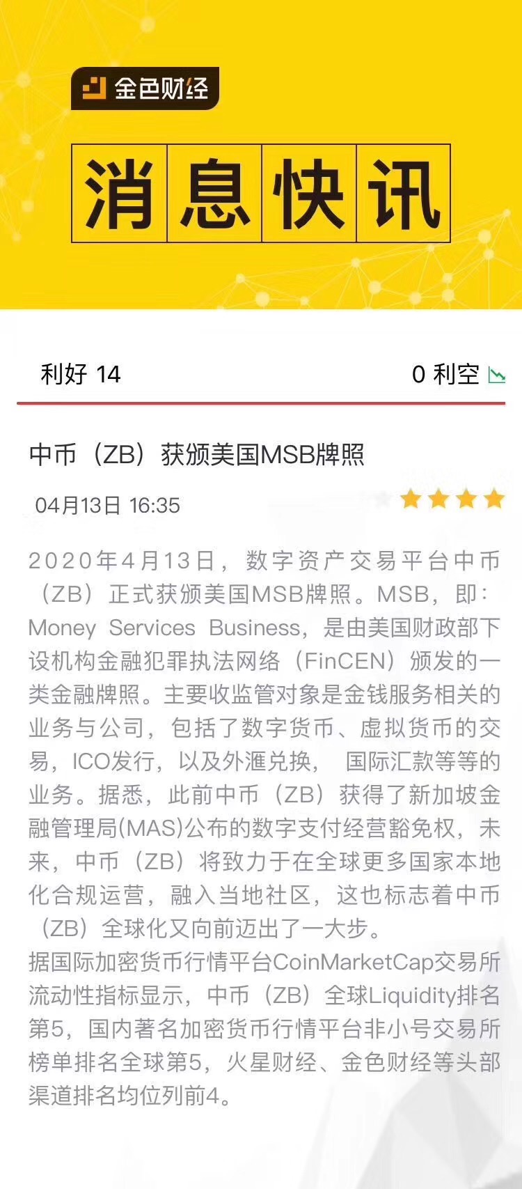就在昨天下午,也就是2020年4月13日,中幣(ZB)數字資產交易平臺官宣已獲頒美國MSB牌照,在合規的路上又多了一份保障。中幣是全球Liquidity排名第五,國內著名的加密貨幣行情平臺非小號交易所榜單排名全球第五。
