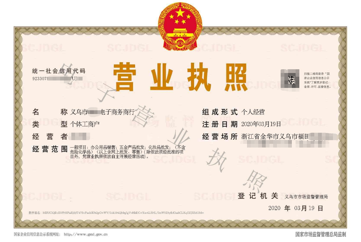 4)個體戶名稱:由工商局預先核準通知書,隨機核名取名,如義烏市XX電子商務商行。