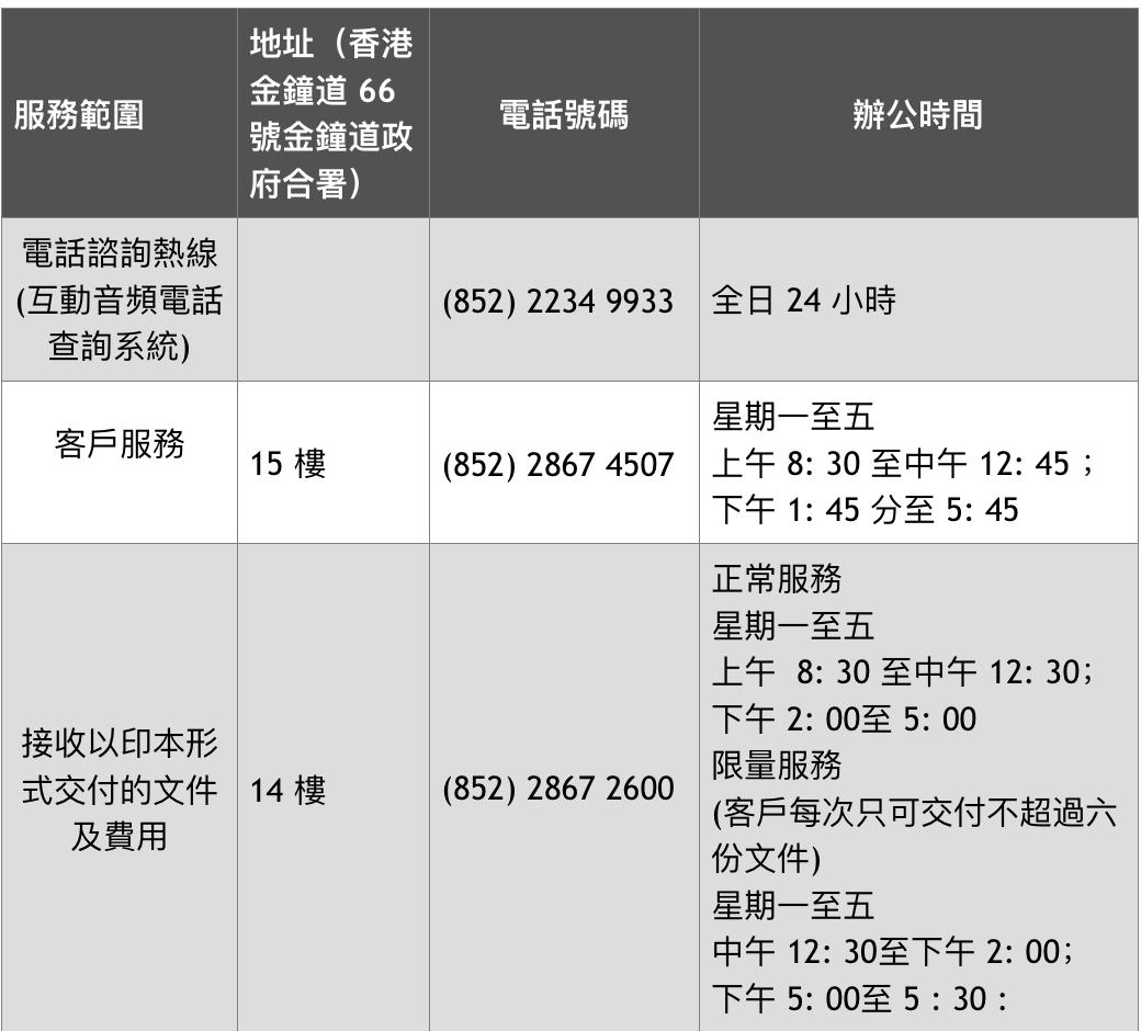 為減少社交接觸以減低疫情在社區傳播的風險,市民應盡量避免前往該署的辦事處。 如須送交文件至該署,市民可使用該署設于金鐘道政府合署高座大堂樓層的指定寄存辦理箱。 市民亦可使用該署的電子服務及透過以下方法聯絡該署: