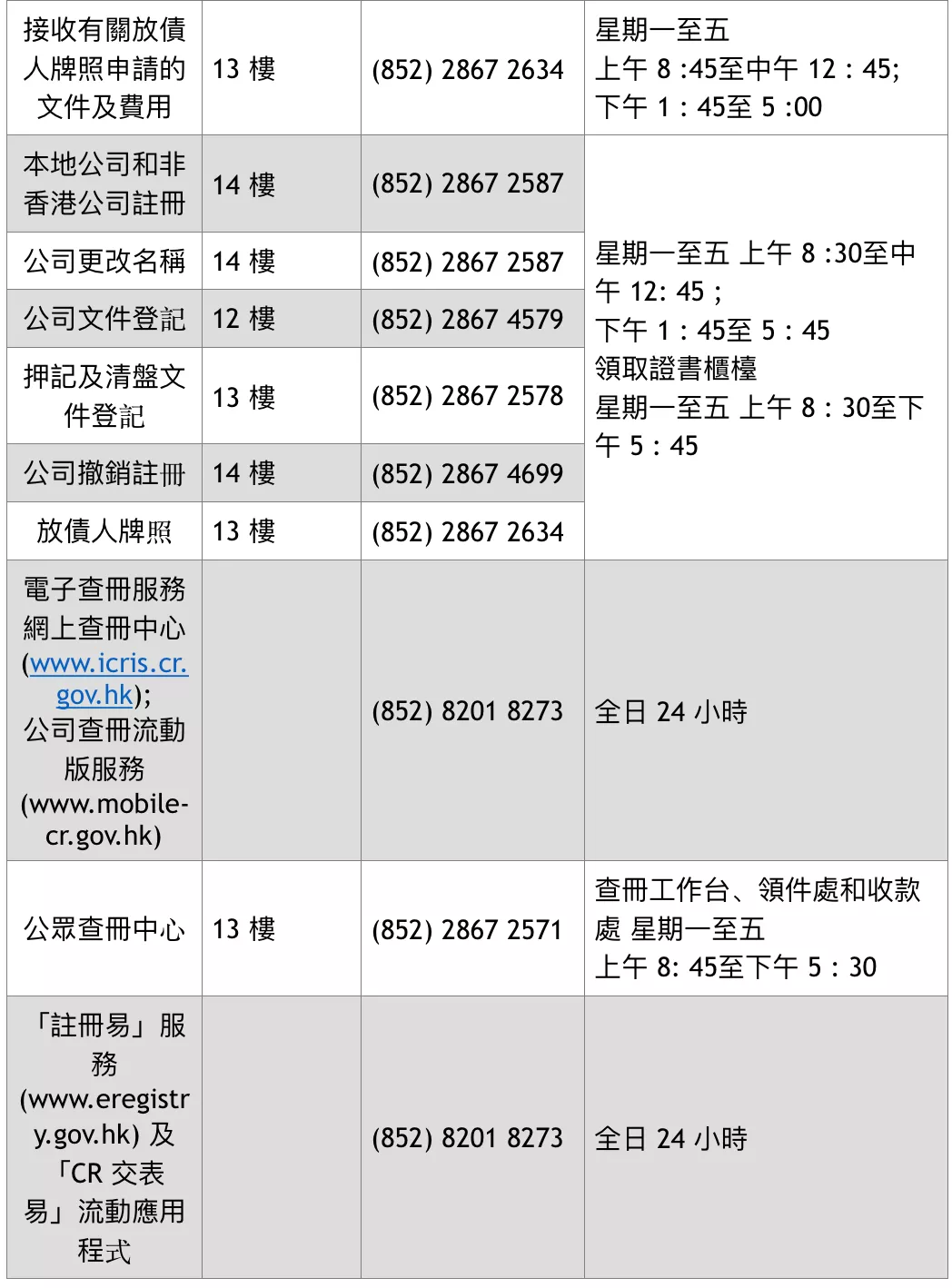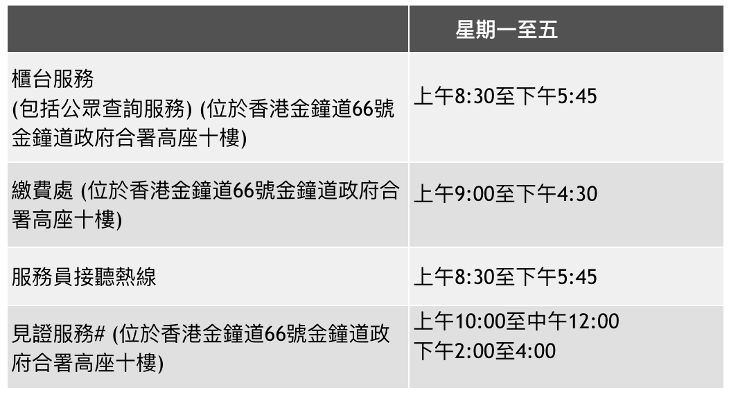 柜臺服務由5月4日起恢復正常辦公時間正常辦公時間的詳情如下:公司注冊處(金鐘道政府合署)