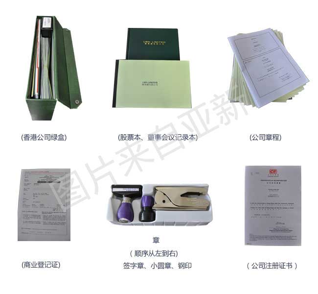 注冊證書(CI);商業登記證(BR);法團成立表格(NNC1);公司章程(MA);董事會議記錄;董事決議書;股票本;董事會議記錄本;簽字章、小圓章及鋼印各一枚;精美燙金綠盒。