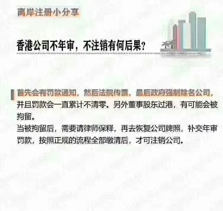 HK公司年審指HK政F相關職能部門對HK公司進行每周年一次的資歷審查,觸及的規(guī)模主要是運營狀況、贏利狀況和報稅等方面。根據HK法例,HK公司在建立滿周年時,都必須處理年審手續(xù)(周年申報表),以持續(xù)合法運營。不年審也不刊出將會發(fā)生如下后果: