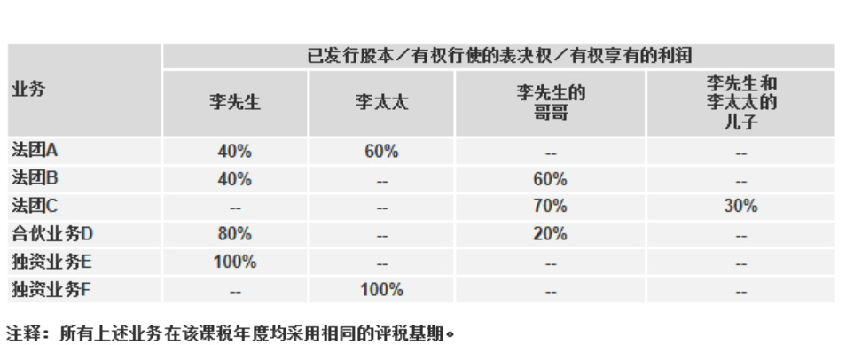 李先生和他的家庭成員擁有以下業務: 合伙業務D和獨資業務E屬有關連實體,原因是它們均受李先生的控制。只有合伙業務D或獨資業務E其中之一可以在其合伙業務的利得稅報稅表內或在李先生的個別人士報稅表內選擇按兩級制利得稅率課稅。