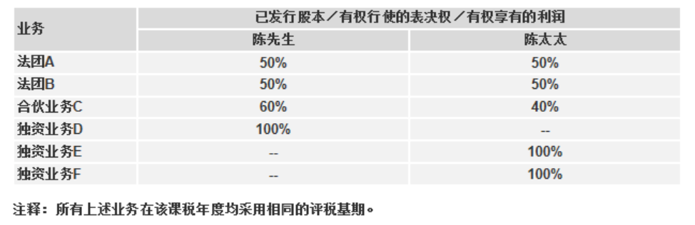 獨資業務E和獨資業務F亦屬有關連實體,原因是它們都是陳太太經營的獨資業務。陳太太在其個別人士報稅表內,只可選擇獨資業務E或獨資業務F其中之一按兩級制利得稅率課稅。