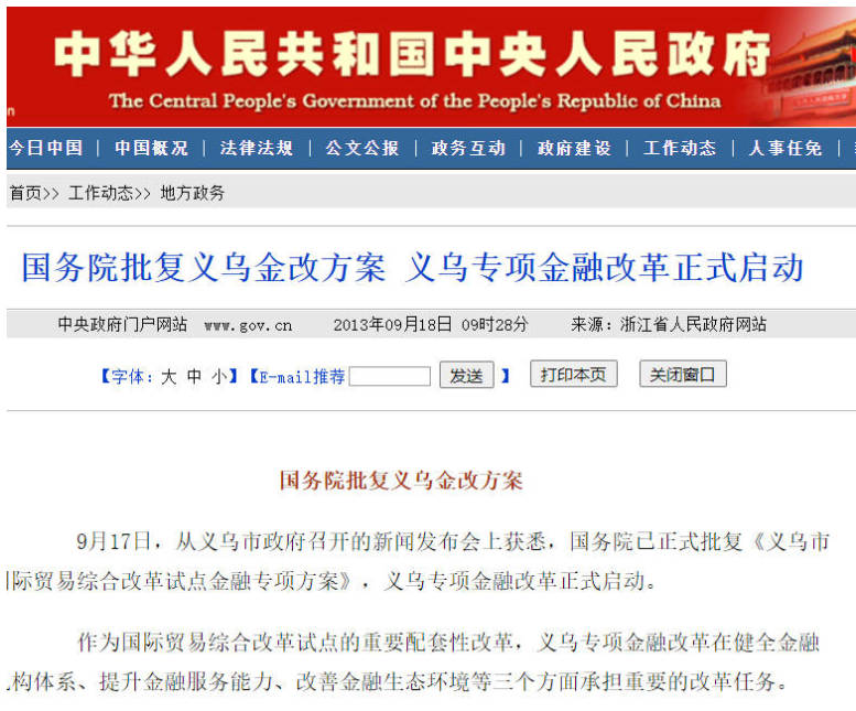 2013年9月17日國務院已正式批復《義烏市國際貿易綜合改革試點金融專項方案》,義烏市市長何美華說;主要核心的突破點在貿易金融方面的創新. 其實義烏是典型的外貿型經濟,這次的金改方案有些內容就專門針對外貿金融做了大膽的嘗試,比如允許符合條件的境外自然人在取得個體工商戶營業執照后,開立個人外匯結算賬戶,探索符合條件的個人直接以人民幣結算進出口貿易等。