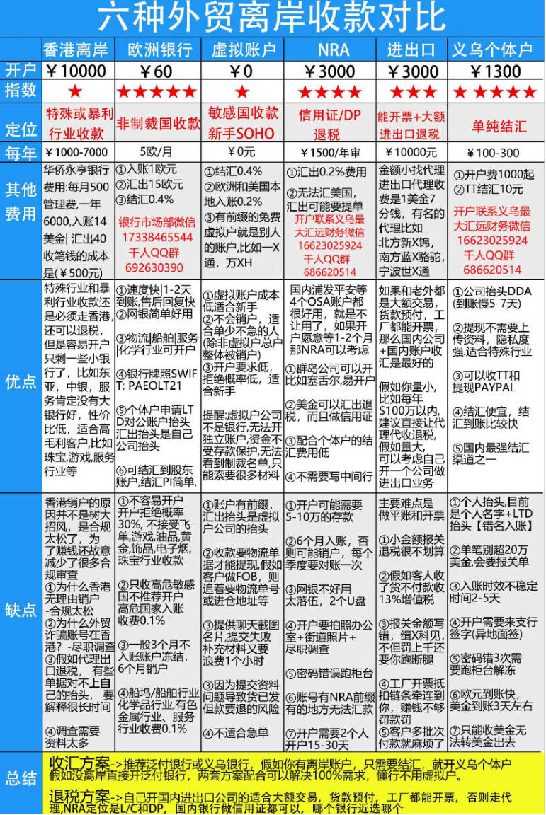 義烏個體戶主要優點能無限額結匯,到賬1-3天,并且開建行還可做虛擬產品(比如游戲幣,谷歌傭金啊等),結匯無需提供物流和PI,隱私更強. 能收個人的PAYPAL提現,缺點是開戶需要本人帶身份證跑支行簽到(全國9個城市支行)缺點②無法退稅和美金轉賬.個體戶賬戶可以收匯,但是不可以美金提現轉賬,所以如果說你的美金收進來就需要結匯人民幣那么直接用個體戶賬戶,如果說美金需要匯到工廠退稅或者說國外客戶不接受個人賬戶匯款的情況就用泛付③無法收企業PP提現④每次備注都要寫中間行,這個比較麻煩!