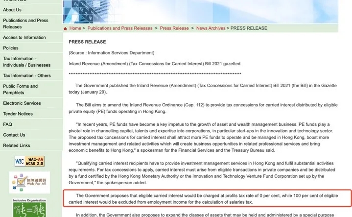 2021年1月29日,香港政府刊憲《2021年稅務(修訂)(附帶權益的稅務寬減)(Tax Concessions for Carried Interest)條例草案》(《條例草案》),就基金管理公司及雇員獲發的附帶權益,豁免全部利得稅和薪俸稅,并將在2月3日提交立法會進行首讀。