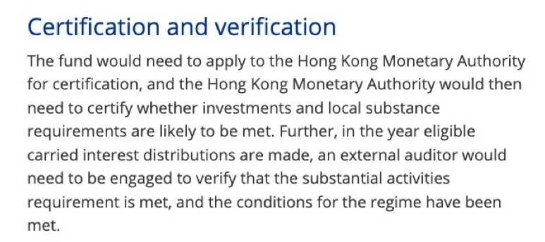 根據實際情況,如某對沖交易屬于私募股權交易的組成部分,而該對沖交易的利潤亦涵蓋在私募股權交易的損益中,用以計算具資格附帶權益,則該對沖交易所衍生的附帶權益或可獲稅務寬減。作為稅務寬減的先決條件,經核證投資基金或指明實體的上述合資格交易產生的利潤必須根據《稅務條例》中關于統一基金豁免制度的第20AN或20AO條獲豁免利得稅。