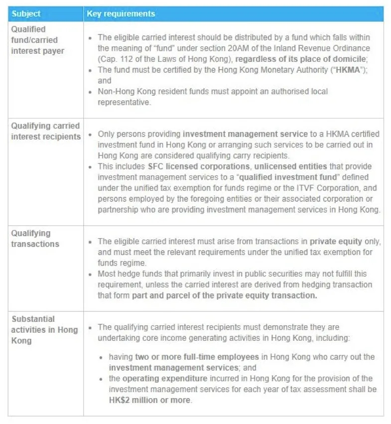 基金需要申請香港金融局頒發的相關牌照,與《稅務條例》現有的其他稅務優惠制度一致,即將實施的附帶權益稅務寬減待遇須符合實質活動要求。條例草案規定,利得稅寬減要適用于合資格人士, 合資格人士則須在適用期間的每個課稅年度內, (i)在香港雇用稅務局局長認為足夠數目的合資格全職雇員,以及(ii)在香港承付稅務局局長認為足夠的本地營運開支,包括: