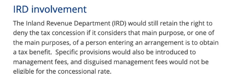 根據《稅務條例》現行的反避稅條文,條例草案建議,合資格收取者須通過“主要目的測試”,才能享受優惠稅率。稅務局(IRD Inland Revenue Department)仍然有權拒絕該基金享受此項稅收優惠制度。如果經過測試發現是有目的安排獲得稅收優惠,則可拒絕。同時,還對管理費做了相關的規定,如果管理費用進行了修飾也不符合該項稅收優惠政策。