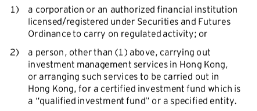 2) 任何在香港為屬“合資格投資基金”的經核證投資基金或指明實體進行投資管理服務或安排在香港提供該等服務的人士(上文第1所述者除外)。