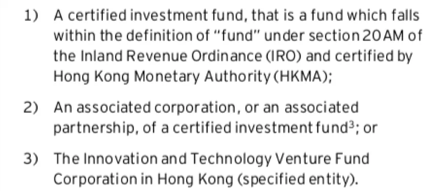 1)經核證投資基金,即符合《稅務條例》第20AM條 所載有關“基金”定義并經香港金融管理局(金管局) 核證的基金;
