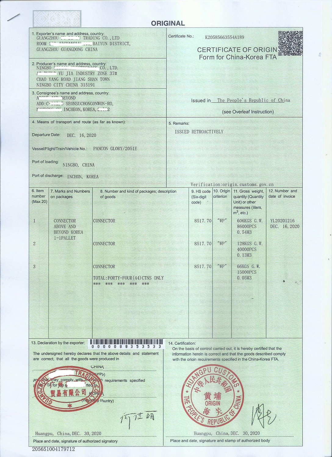 澳門公司不可以辦理中韓FORM K產地證。 中國—韓國自由貿易區原產地證FORM K:證書英文名稱:《CERTIFICATE OF ORIGIN FORM FOR CHINA-KOREA FTA》,簡稱中國—韓國原產地證書或中韓產地證。自2015年12月20 答