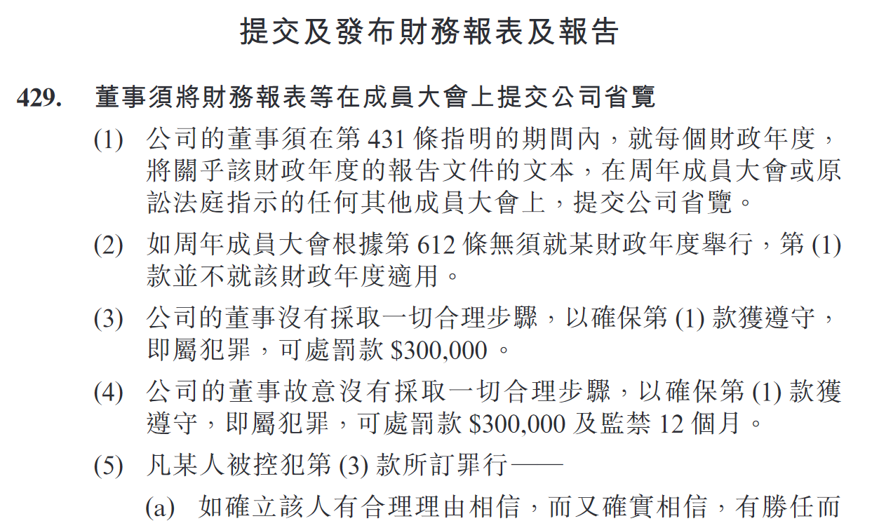 第429條. 董事須將財務報表等在成員大會上提交公司省覽(1)公司的董事須在第431條指明的期間內,就每個財政年度,將關乎該財政年度的報告文件的文本,在周年成員大會或原訟法庭指示的任何其他成員大會上,提交公司省覽。