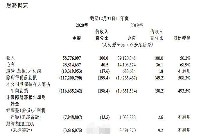 快手2020全年營收587.8億元人民幣,2020年全年凈虧損1166億元,經營虧損103億元,調整后凈虧損79.5億元人民幣。2020年,快手應用的平均日活躍用戶及平均月活躍用戶分別為2.646億及4.811億,分別同比增長50.7%及45.6%。