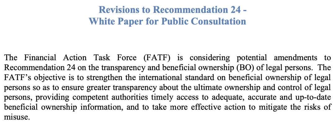 除了更新黑名單和灰名單外,FATF還將對法人實體實益所有人(Beneficial Owner,“BO”)信息透明化使出“新招數”——修訂Recomendation 24。對此,FATF發布了最新的修訂白皮書。白皮書中,FATF認為在環境犯罪和腐敗犯罪中,很多掛名公司(front companies)被用來掩蓋犯罪行為。因此,公司實益所有人信息的透明度對阻止犯罪分子將非法行為隱藏在復雜的公司架構后至關重要。