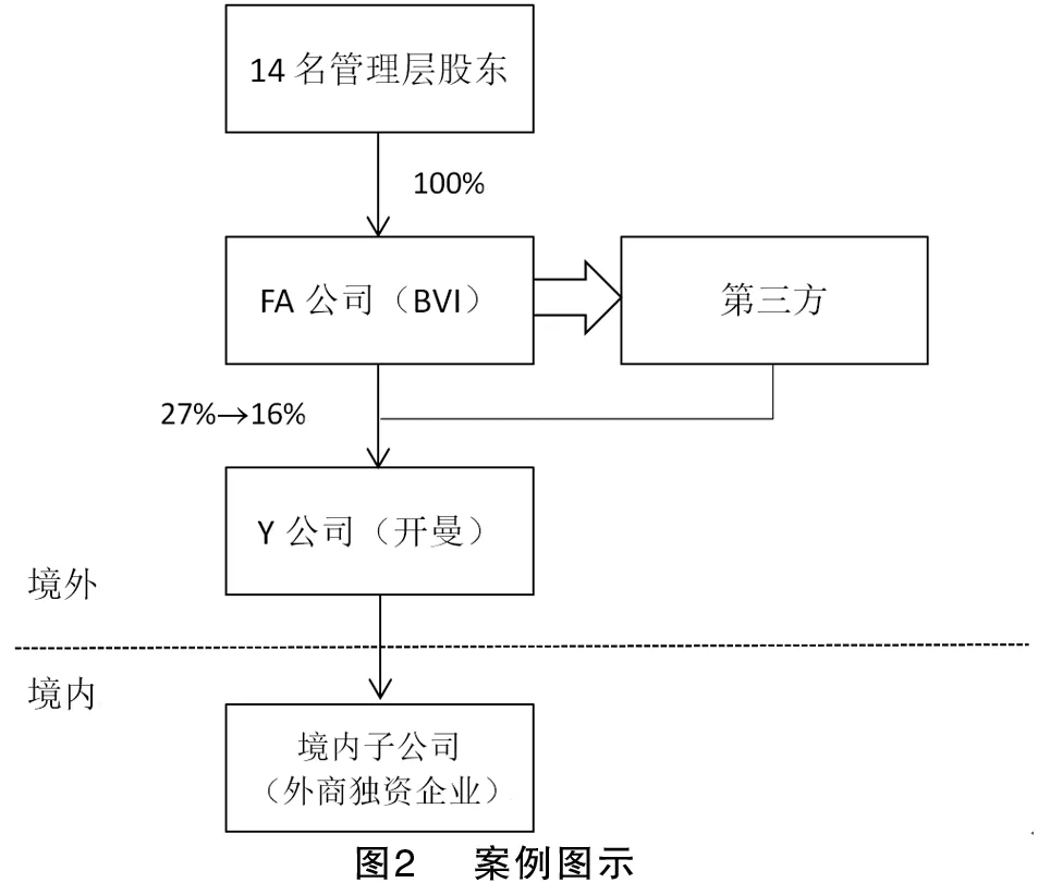 2009年-2010年,14名中國居民個人通過控制(100%持股)注冊在英屬維爾京群島(BVI)市的FA公司,先后兩次總共減持其于開曼群島上市的Y公司(采用紅籌模式上市的境外注冊公司)12200萬股股份(分別為6500萬股、5700萬股),使得FA公司對Y公司持股比例由27%減至16%,總計轉讓獲利逾18億港元(交易結構如圖2所示)。