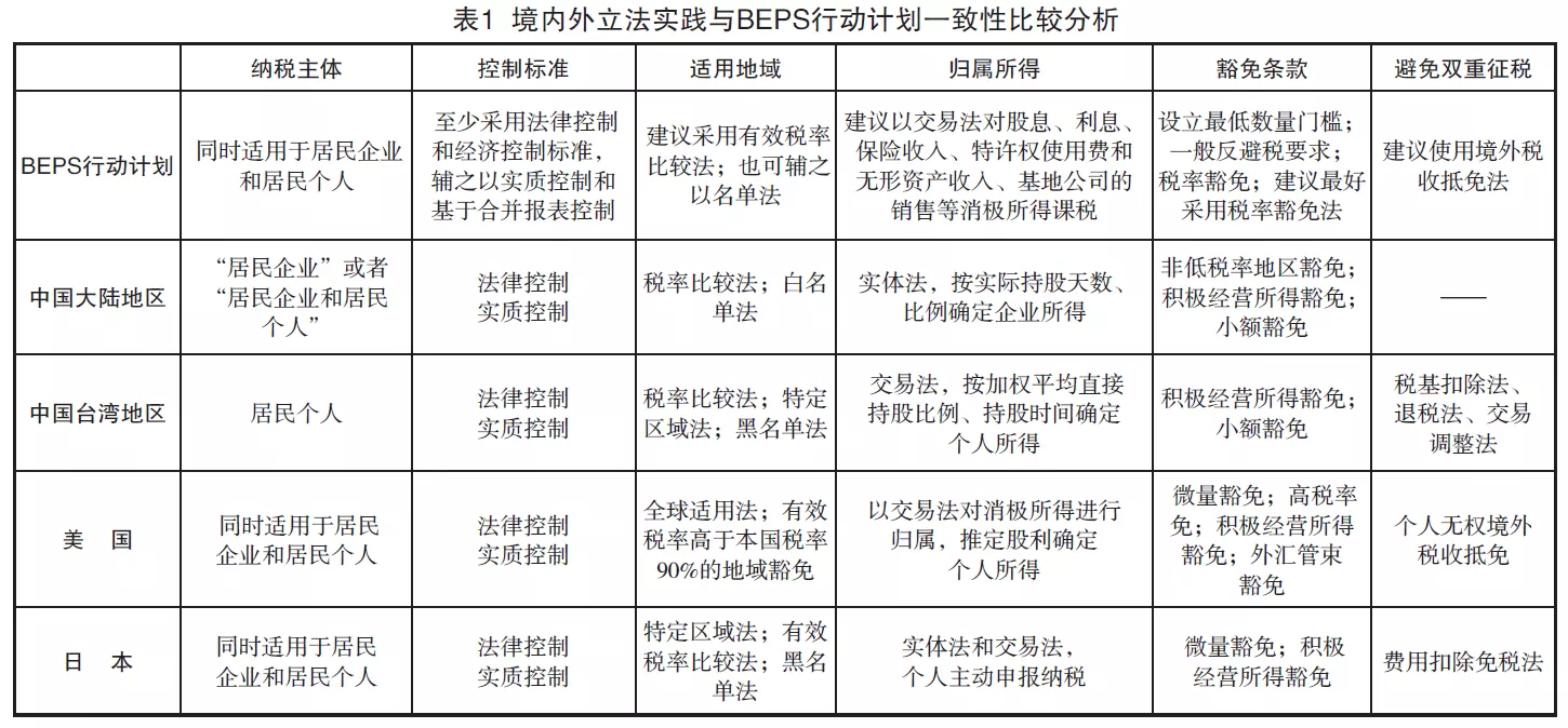 自美國最早立法引入CFC規則后,德國、新西蘭、日本等國也都先后引入CFC規則。目前來看,美國和日本的CFC規則同時適用于居民企業和居民個人。中國臺灣地區在最新反避稅浪潮下也于個人所得稅制度中引入了該規則,且進行細化規定。2015年9月,稅基侵蝕和利潤轉移(BEPS)第3項行動計劃《制定有效的受控外國公司規則》最終報告發布,對CFC規則進行了詳盡的闡述,主要從CFC的定義、豁免條款、防止或消除雙重征稅,以及收入的定義、計算、歸屬六個方面進行政策考量,并為各個國家建立和規范CFC規則體系提供了最佳建議。此外,我國《個人所得稅法》中首次引入CFC規則,是在我國《企業所得稅法》實施CFC規則十余年之后,因此《個人所得稅法》中該規則的完善,要充分考慮與企業所得稅相關規定的銜接,并借鑒企業所得稅反避稅經驗,以便我國在未來建立起統一完善的CFC反避稅規則體系。因此,本文對我國大陸地區《企業所得稅法》、我國臺灣地區“所得基本稅額條例”、美國《國內收入法典》、日本《租稅特別措施法》和BEPS行動計劃中CFC規則的立法實踐經驗進行了總結(見表1)。