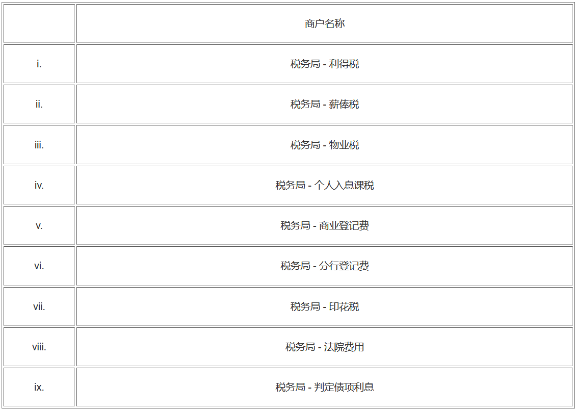 - d. 在確認付款前請小心核對繳交款項的資料,包括商戶名稱、收款帳號和繳付金額,及保留繳付紀錄。有關本局發出之帳單的商戶名稱,請參閱以下列表: