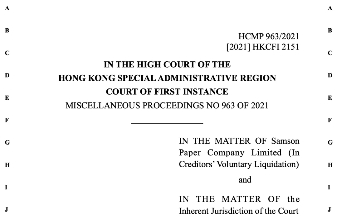 2021年7月20日,香港高等法院做出判決,支持森信紙業(yè)有限公司(Samson Paper Company Limited,簡稱“森信紙業(yè)”或“公司”)香港清盤人的申請,向深圳市中級人民法院破產(chǎn)法庭(“深圳市破產(chǎn)法庭”)發(fā)出請求函,申請對公司清盤人予以認可與協(xié)助。