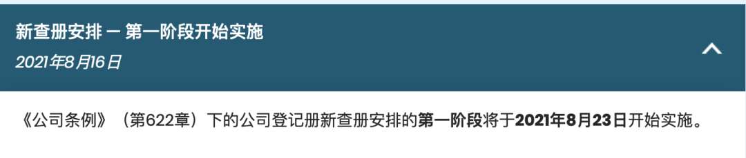 2021年8月16日,香港公司注冊處就《公司條例》下的公司登記冊新查冊安排發布最新消息稱:第一階段將于2021年8月23日開始實施。