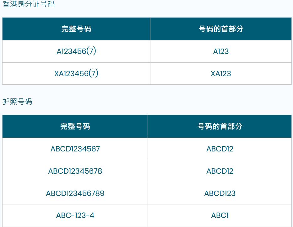如組成身分證號碼或護照號碼(下稱「身分識別號碼」)的字母或數目字字元序列的字元數目是雙數,則該號碼序列的前半部分必須提供予公眾查閱。 如組成有關身分識別號碼的字母或數目字字元序列的字元數目是單數,則由該序列的首個字元開始,至處于該序列正中間位置的字元為止的部答