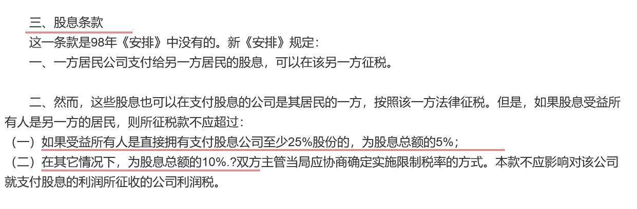 香港公司獲得內地投資企業股息分紅可能適用《內地和香港特別行政區關于對所得避免雙重征稅和防止偷漏稅的安排》有關股息的條款,1.一方居民公司支付給另一方居民的股息,可以在另一方征稅。2.然而,這些股息也可以在支付股息的公司是其居民的一方,按照該一方法律征稅。但是,如果股息受益所有人是另一方的居民,則所征稅款不應超過如下要求,即如果受益所有人是直接擁有支付股息公司至少25%股份的,為股息總額的5%。在其他情況下(股份低于25%),為股息總額的10%。雙方主管當局應協商確定實施限制稅率的方式。本款不應影響對該公司就支付股息的利潤所征收的公司利潤稅。