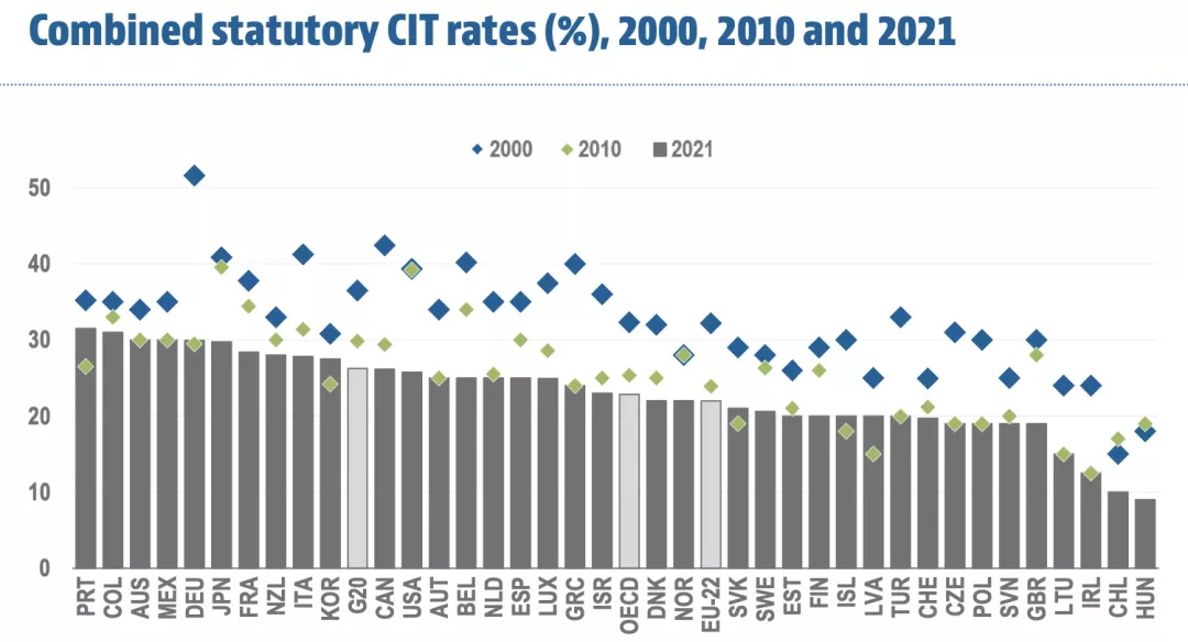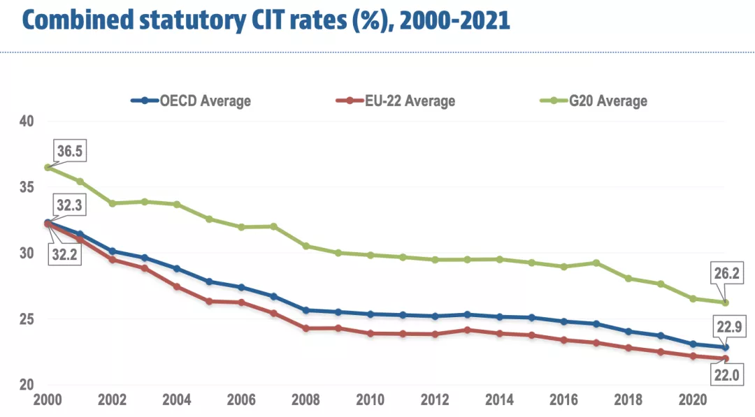 早在2000年時,OECD成員平均CIT稅率和歐盟22國(EU-22)平均CIT稅率比較接近,都在32.2%左右。但是,到了2021年的今天,前者的平均稅率為22.9%,已經超出了后者22.0%的稅率近一個百分點。