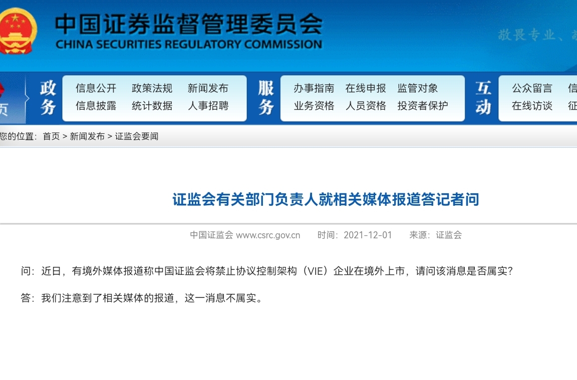 近日有境外媒體報道稱,中國證監會將禁止協議控制架構(VIE)企業在境外上市。就此,中國證監會相關部門負責人表示,證監會已經注意到了相關媒體的報道,這一消息不屬實。