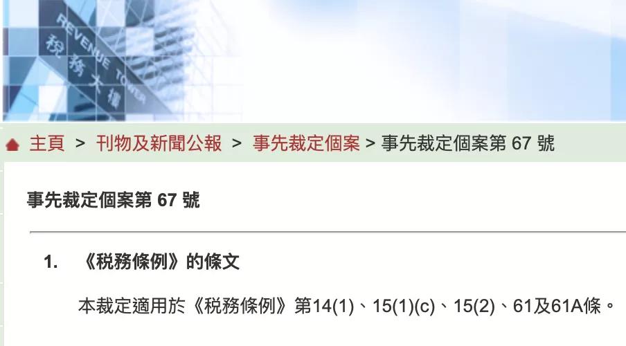 本裁定適用於《稅務條例》第14(1)、15(1)(c)、15(2)、61及61A條,具體如下:1.《稅務條例》第 14(1)條規定,任何人在香港經營任何行業、專業或業務而從該行業、專業或業務獲得于香港產生或得自香港的應課稅利潤(售賣資本資產所得的利潤除外),則須向該人征收利得稅。