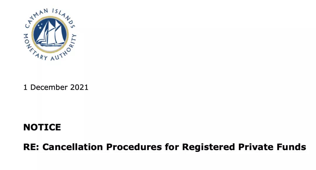 2021年12月1日,開曼群島金融管理局(The Cayman Islands Monetary Authority,“CIMA”)發(fā)布了“針對注冊私募基金注銷程序的通知”(Re: Cancellation Procedures for Registered Private Funds)。