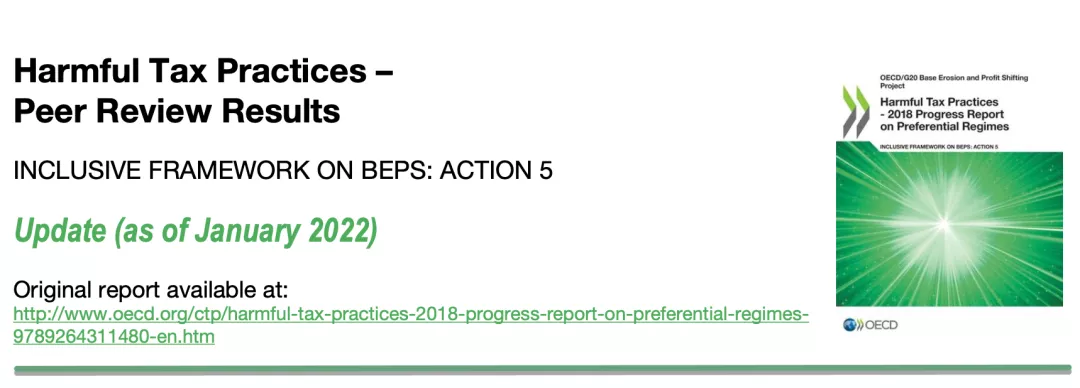 2022年1月24日,OECD 發(fā)布《有害稅收實踐-同儕審議結果》(Harmful Tax Practices - Peer Review Results), 披露了BEPS(Base Erosion and Profit Shifting, “稅基侵蝕和利潤轉移” )框架下全球有害稅收實踐及稅收確定性的最新進展。