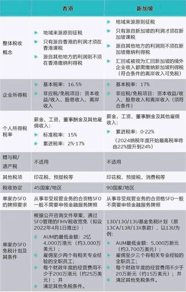 但是,如果您仔細對比,還是能夠感受到香港在境外利潤征稅、企業所得稅基本稅率、SFO最低管理資產(Assets under Management, AUM),以及雇傭有經驗全職員工要求等方面的門檻略低于新加坡。