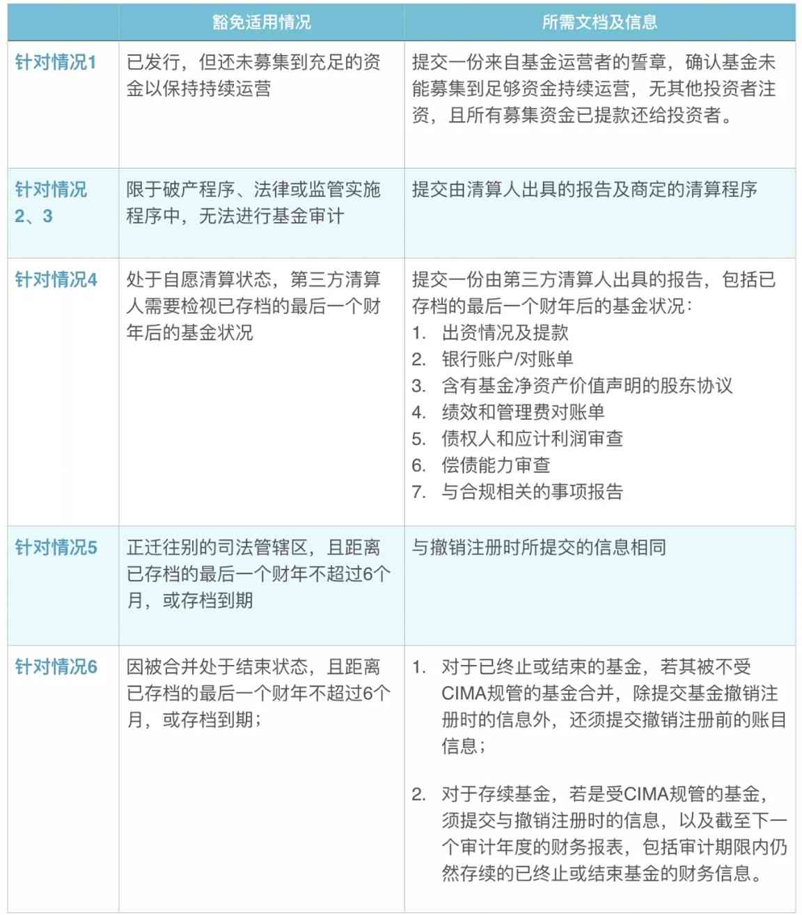 針對上面六種情況,我們為您整理出所需提交的不同文檔、信息及費用詳情如下表,供您參考:除了上述特定的所需文檔及信息外,申請審計豁免時還需要提交誓章,并繳納相應費用。CIMA會根據基金實際情況來判斷是否予以豁免。