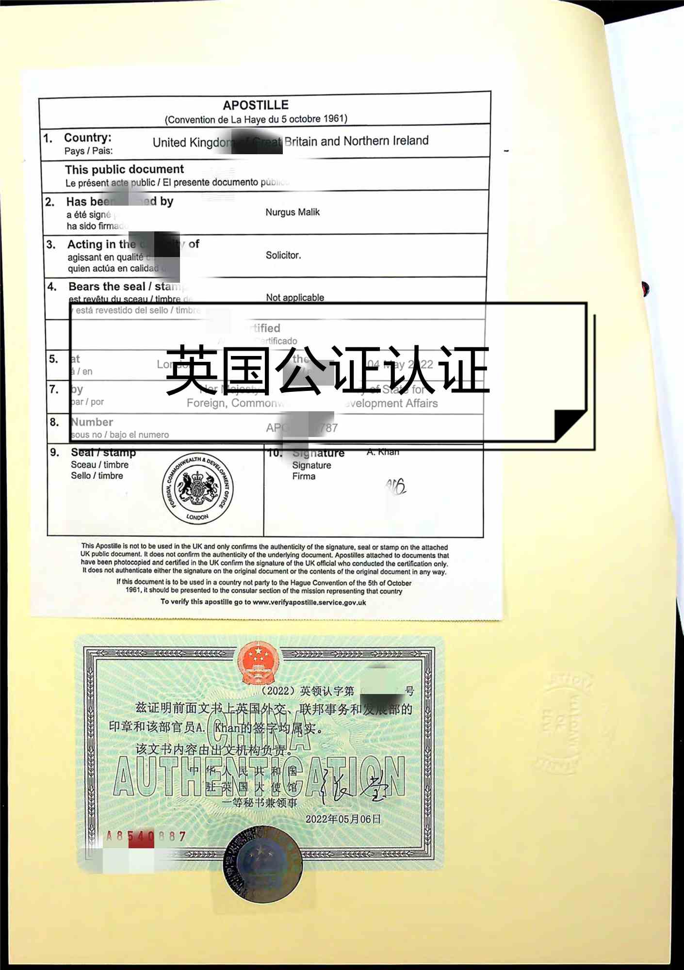 英國外交部受理加簽并附加證明為海牙認證