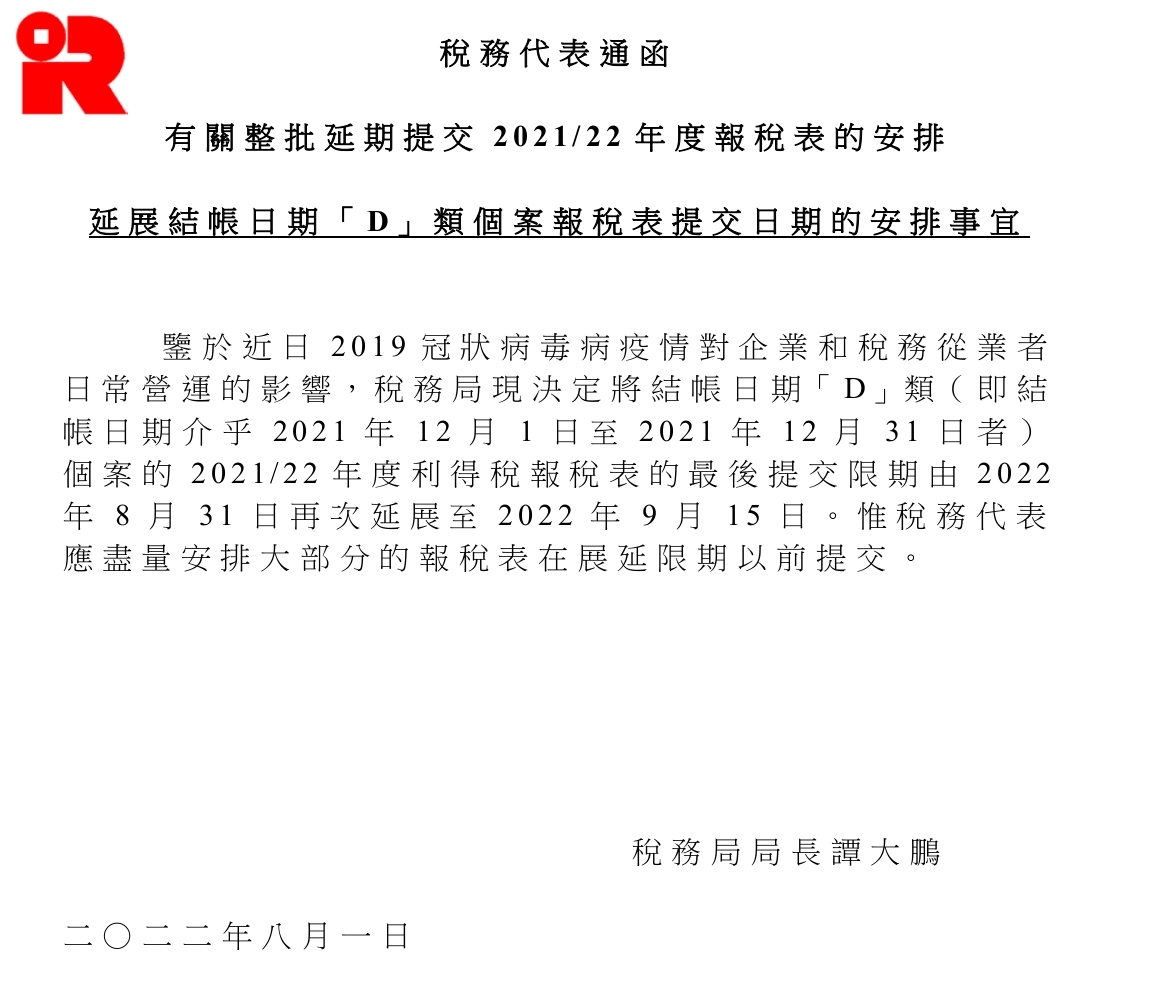 鑒于近日疫情對企業和稅務從業者日常營運的影響 , 稅務局現決定將結賬日期「 D」類( 即結賬日期介乎 2021年12月1 日至2021年12月31日者 )個案的2021/22年度利得稅報稅表的最后提交限期由2022年8月31日再次延期至2022年9月15 日 。 稅務代表應盡量安排大部分的報稅表在延期限期以前提交 。